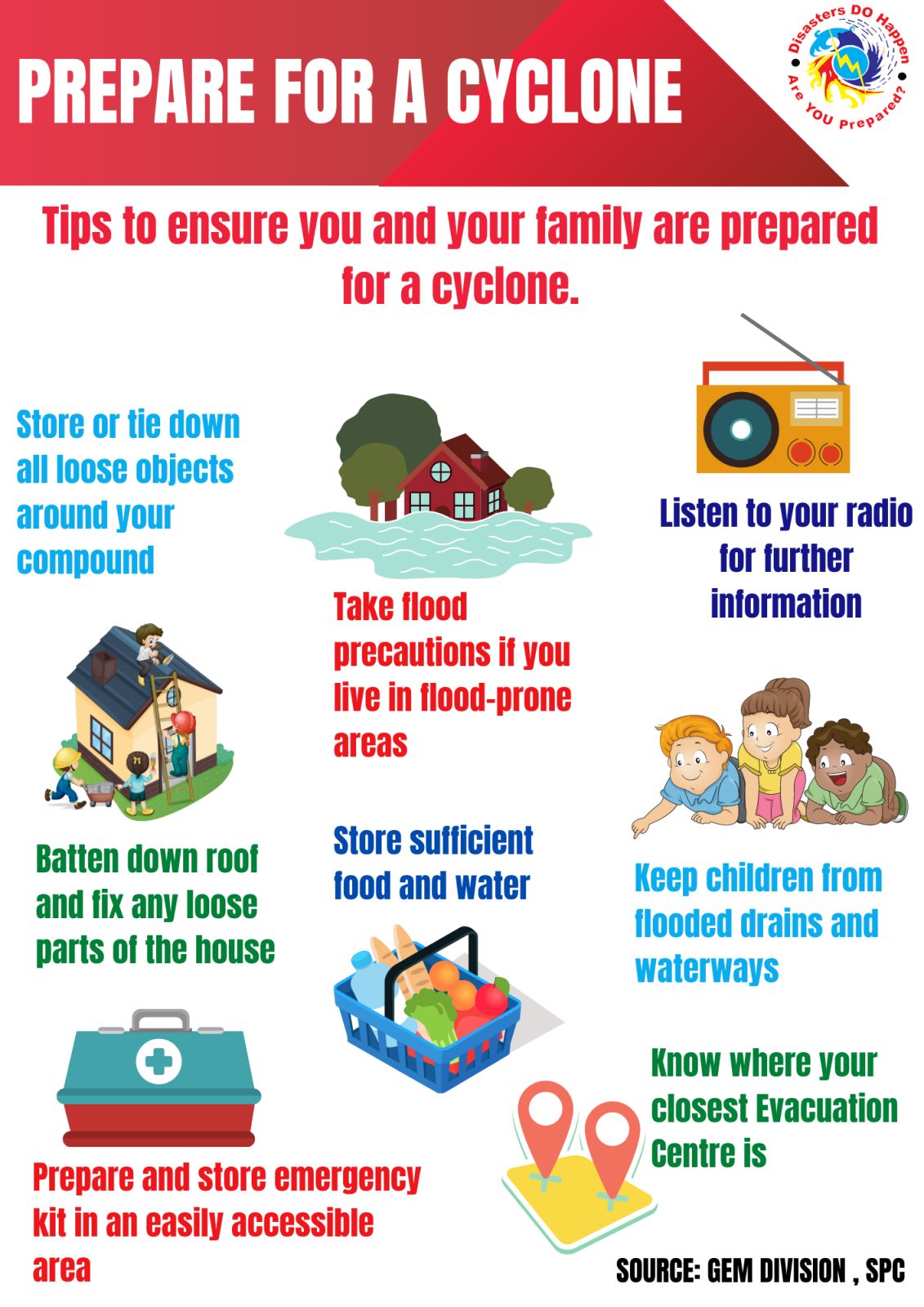 Turn off power, gas, and water; How can we prepare prevent protect against the cyclone? If the building starts to break up, protect yourself with mattresses, rugs or blankets under a strong table or bench or hold onto a solid fixture, such as a post or water pipe.